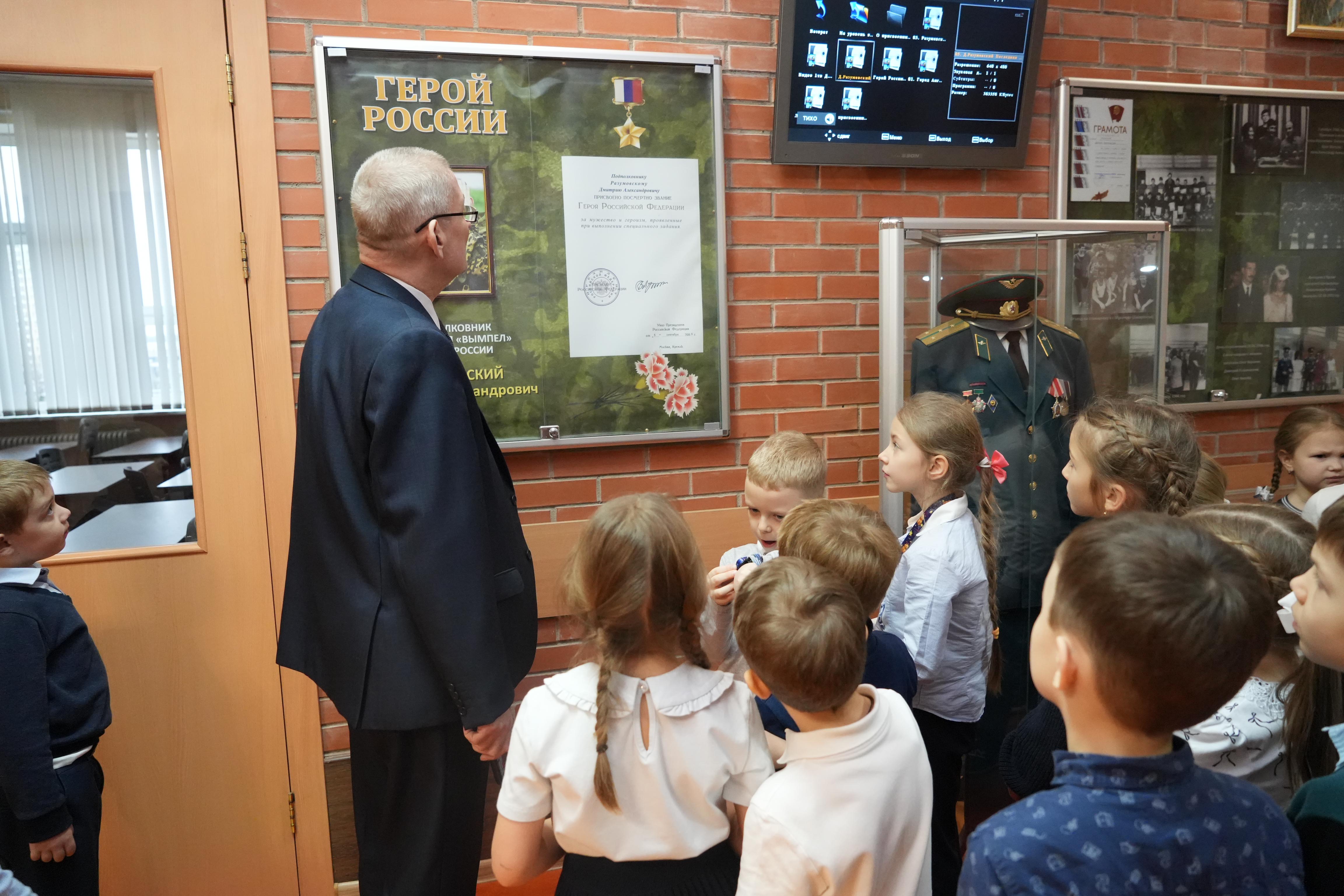 Сердцем экскурсии стал рассказ о главном Герое, чьё имя с честью носит наша школа – Дмитрии Александровиче Разумовском. Виктор Николаевич простыми и искренними словами поведал о жизни, службе и бессмертном подвиге Дмитрия Александровича.